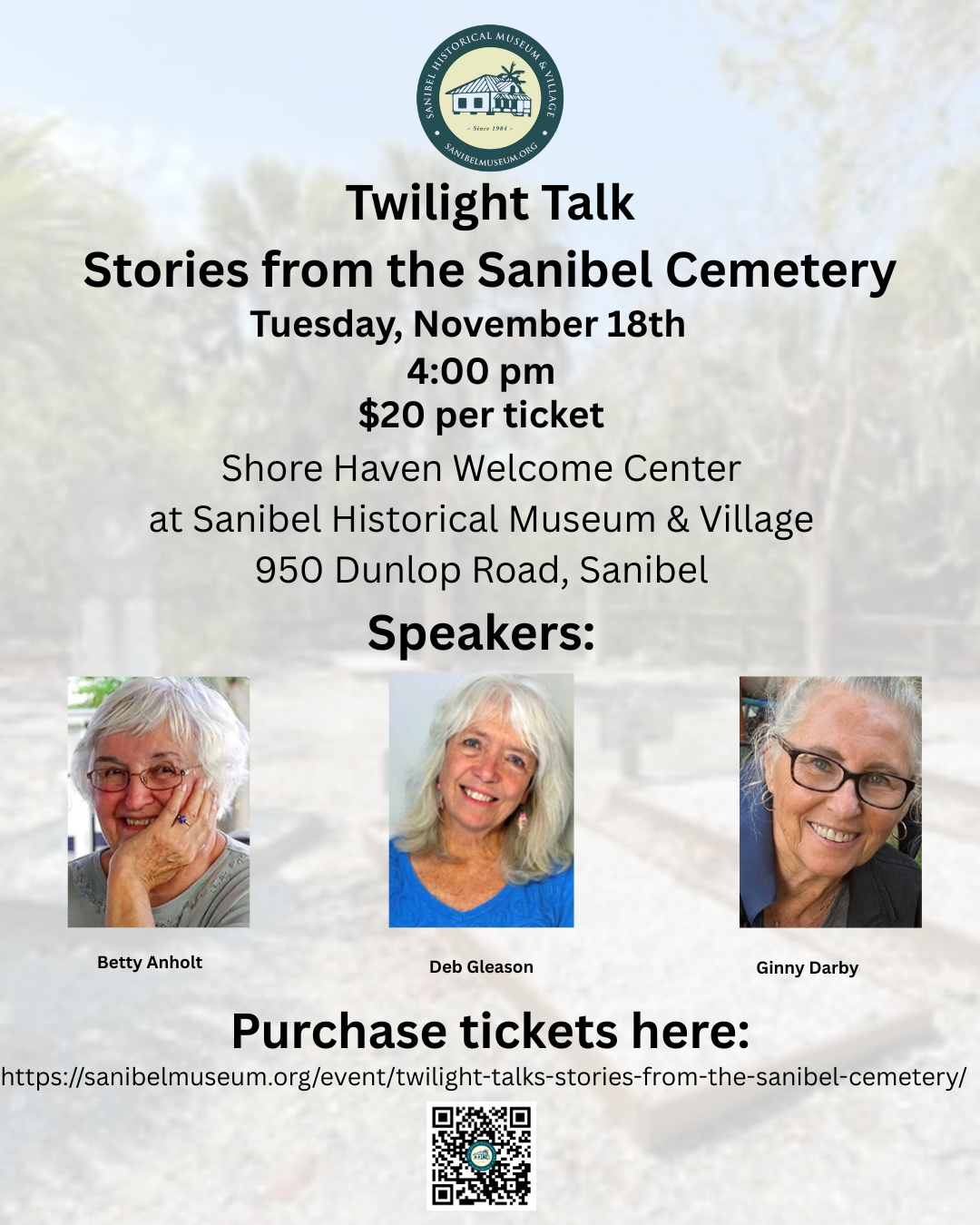 SHMV’s popular Twilight Talks Series has been RESCHEDULED from October 28 to Tuesday, November 18 with Stories from the Sanibel Cemetery in the Village’s Shore Haven at 4:00 p.m. Join us to honor and remember those buried in the sands of Sanibel. A trio of local experts will share these notable tales: Betty Anholt, Ginny Darby and Deb Gleason.